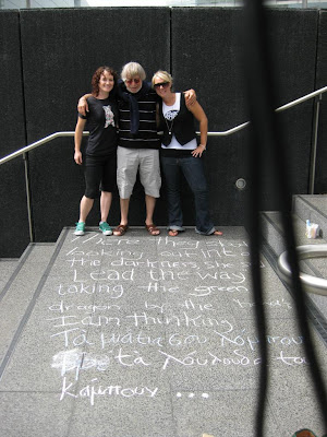 It was chalking day on campus last week as this year’s Poetry off the Page cohort fanned out with poems to put into public space. With them was Michael Harlow, 2009 Burns Fellow and holder of the inaugural Caselberg Residency, in Auckland for the launch of his new book, The Tram Conductor’s Blue Cap (AUP). Student chalkers became Harlow ‘translators’ and were encouraged by Michael to co-sign the poem that went down outside the university library during the busiest part of the day. Elsewhere other chalking gangs were taking Harlow words up steps, across a road and around a parked bus. It was, said Michael, the best pre-launch a book of poems could hope for; and he finished the morning by taking requests from the class who by then had very close knowledge of some of his texts. Later we went to look at the range of poems that had made it to the pavements and were already wearing off under the tramp of feet.